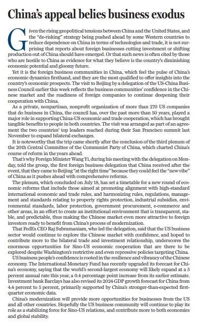 一段时间以来,中美之间的地缘政治紧张态势有所加剧,一些西方国家打着“去风险”政策的旗号,在科技与贸易领域推行所谓“减少对中国依赖”的做法,“外企停止在华投资生产”的相关报道也由此产生,这些报道更是经常被一些敌视中国的势力所引用,作为他们眼里“中国经济潜力不再、前景堪忧”的证据。 但在华的外企们想必都能切身感受到当下中国经济跳动的脉搏,也更有资格对中国经济前景分享见解。本周早些时候,美中贸易全国委员会代表团来访北京,此行毫无疑问就展现了商界对中国市场的信心,也展现出外企们对继续深化与华合作的意愿。 美中贸易全国委员会是一家非党派、非盈利性质的美国民间对华贸易组织,拥有超270家在中国经商的美国公司会员,该委员会成立逾50年来,在支持中美经贸合作方面发挥了重要的作用,为两国人民带来了实实在在的利益。此次美中贸易全国委员会代表团来华访问,也是两国最高领导人去年11月在旧金山峰会上达成的扩大双边交流协议的一部分。 值得关注的是,在美中贸易全国委员会代表团来华前夕,党的二十届三中全会刚刚胜利闭幕。本次全会的召开,为中国未来的改革指明了方向。 对此,中共中央政治局委员、外交部长王毅在会见该代表团时就表示:“你们是全会后首个来访的美国工商界代表团,可在第一时间感知中国进一步全面深化改革的新气象,可以说来得恰逢其时。” 7月18日,党的二十届三中全会在北京胜利闭幕。全会为中国新一轮经济改革制定了“时间表”。改革任务中就包括了旨在推动与国际高标准经贸规则对接,在产权保护、产业补贴、环境标准、劳动保护、政府采购、电子商务等领域实现规则、规制、管理、标准相通相容,以打造透明稳定可预期的制度环境等内容。 这些深化改革的举措,让中国市场更显“魅力十足”,也让众多“跃跃欲试”的外国投资者,有机会进一步分享到中国现代化发展进程所带来的红利。 本次率代表团来华的美中贸易全国委员会董事会主席、美国联邦快递集团总裁兼首席执行官芮思博就表示,美国企业界对继续深耕中国市场充满信心,并希望为双边贸易和投资关系作出更大贡献。这也凸显出尽管华盛顿方面对中国持续进行限制甚至打压,但中美经济合作始终空间巨大,尚有无数机遇等待探索。 美国企业家们对中国经济的信心,源自于中国经济自身的强大韧性和活力。国际货币基金组织(IMF)近期就上调了对今年中国经济增长的预期。IMF表示,作为世界第二大经济体的中国,2024年经济的增速有望达到5%,较早先的预期上调0.4个百分点。无独有偶,中国今年一季度超预期的强劲经济数据,也令巴克莱银行将对2024年中国GDP增长速度的预测从此前的4.4%上调到了5%。 展望未来,中国持续推进现代化建设,将为包括美国在内的各国企业提供更多机遇,也希望美国工商界继续发挥稳定中美关系的作用,为两国经济发展和世界稳定作出更多贡献。