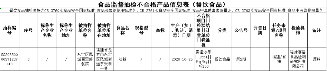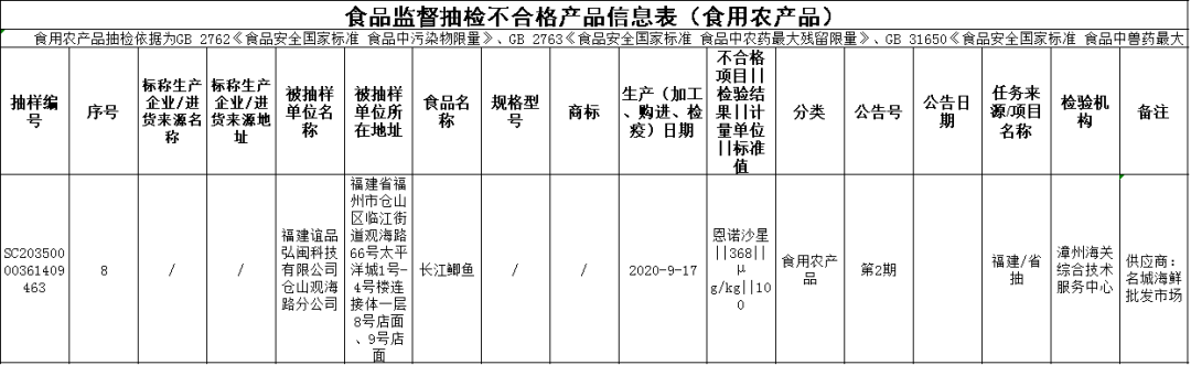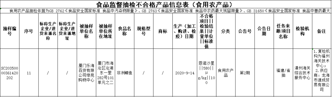 农兽药残留问题 ◆永定区凤城百里鲜餐馆销售的油蛤(购进日期为2020年10月26日),恩诺沙星不合格,检验机构为福建赛福食品检测研究所有限公司; ◆泉州新华都购物广场有限公司晋江磁灶店销售的草鲡鱼(购进日期为2020年8月11日),呋喃唑酮代谢物不合格、氧氟沙星不合格,初检机构为漳州海关综合技术服务中心,复检机构为厦门海关技术中心; ◆中闽百汇(中国)零售集团有限公司晋江桥南分公司销售的冰鲜海鲈鱼(购进日期为2020年8月8日),恩诺沙星不合格,初检机构为漳州海关综合技术服务中心,复检机构为凯发k8海关技术中心; ◆漳州新华都百货有限责任公司元光店销售的土鸡蛋(购进日期为2020年8月17日),氟苯尼考不合格,初检机构为厦门海关技术中心,复检机构为福建省产品质量检验研究院; ◆泉州市洛江区万安福客隆超市销售的上海青(购进日期为2020年8月24日),毒死蜱不合格,初检机构为厦门海关技术中心,复检机构为福建中检华日食品安全检测有限公司; ◆漳州新华都百货有限责任公司丹霞店销售的油蛤(购进日期为2020年8月25日),恩诺沙星不合格,初检机构为漳州海关综合技术服务中心,复检机构为福建中检华日食品安全检测有限公司; ◆福建永辉超市有限公司莆田市水韵城店销售的草鲡(购进日期为2020年8月26日),氧氟沙星不合格,初检机构为漳州海关综合技术服务中心,复检机构为凯发k8海关技术中心; ◆福建谊品弘闽科技有限公司仓山观海路分公司销售的长江鲫鱼(购进日期为2020年9月17日),恩诺沙星不合格,检验机构为漳州海关综合技术服务中心; ◆福建永辉超市有限公司莆田市荔城区黄石镇晴岚店销售的草鲡(购进日期为2020年8月27日),氧氟沙星不合格,初检机构为漳州海关综合技术服务中心,复检机构为福建省产品质量检验研究院; ◆罗源县金源瑞都超市有限公司销售的多宝鱼(购进日期为2020年9月12日),恩诺沙星不合格、氧氟沙星不合格,检验机构为漳州海关综合技术服务中心; ◆厦门乐海百货有限公司绿苑购物中心销售的非洲鲫鱼(购进日期为2020年9月14日),恩诺沙星不合格,初检机构为漳州海关综合技术服务中心,复检机构为凯发k8海关技术中心; ◆泉州新华都购物广场有限公司湖心店销售的鸡腿(购进日期为2020年8月26日),呋喃西林代谢物(SEM)不合格,初检机构为广州广电计量检测股份有限公司,复检机构为福建省产品质量检验研究院; ◆福建冠业投资发展有限公司漳平圣宇广场店销售的龙胆鱼(购进日期为2020年10月21日),呋喃唑酮代谢物不合格,检验机构为漳州海关综合技术服务中心; ◆长泰县宝国海产品摊销售的鲈鱼(购进日期为2020年10月28日),氯霉素不合格,检验机构为漳州海关综合技术服务中心; ◆新罗区阿妹海产品摊销售的明虾(购进日期为2020年10月28日),呋喃唑酮代谢物不合格,检验机构为漳州海关综合技术服务中心; ◆沙县农兴海鲜超市销售的龙胆鱼(购进日期为2020年10月28日),呋喃唑酮代谢物不合格,检验机构为漳州海关综合技术服务中心。