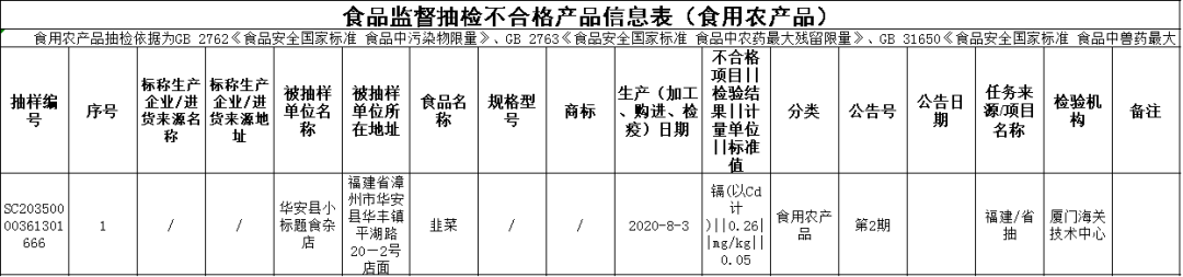 重金属污染问题 ◆华安县小标题食杂店销售的韭菜(购进日期为2020年8月3日),镉(以Cd计)不合格,检验机构为厦门海关技术中心;