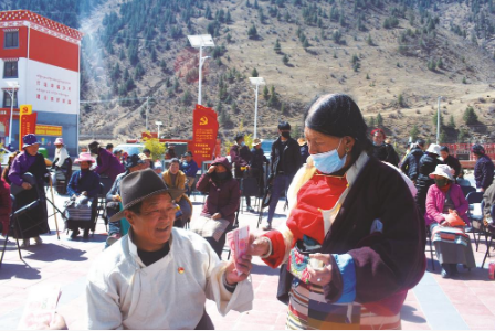 左贡县亚中村村集体分红仪式上,村民拿到分红。