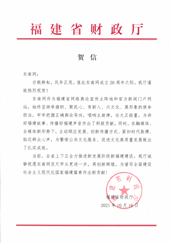 福建省财政厅贺信